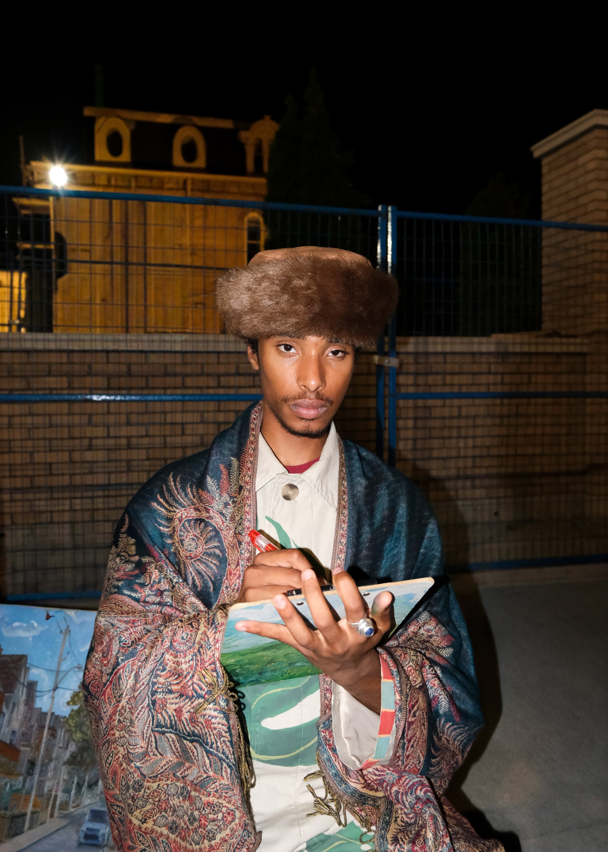 Nile X (b. Dec 2005) is a self-taught painter and designer based in Toronto. He began painting and selling his work on the streets of the city at the age of twelve, working in high-traffic public spaces such as Dundas Square. Since then, his practice has expanded to include textiles and wearable art. He is currently studying Material Arts and Design at OCAD University.